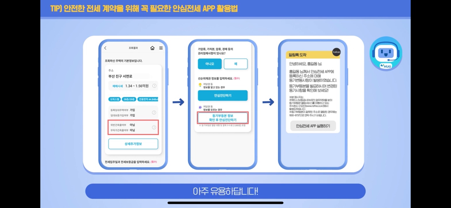 이처럼 "안심전세 앱은 임차인들이 확인해야 할 정보를 안내해 주는 전세계약의 등대 역할을 할 것이며 지속적인 업데이트를 통해 사용성과 편의성을 더욱 강화하겠다"라고 밝혔다.