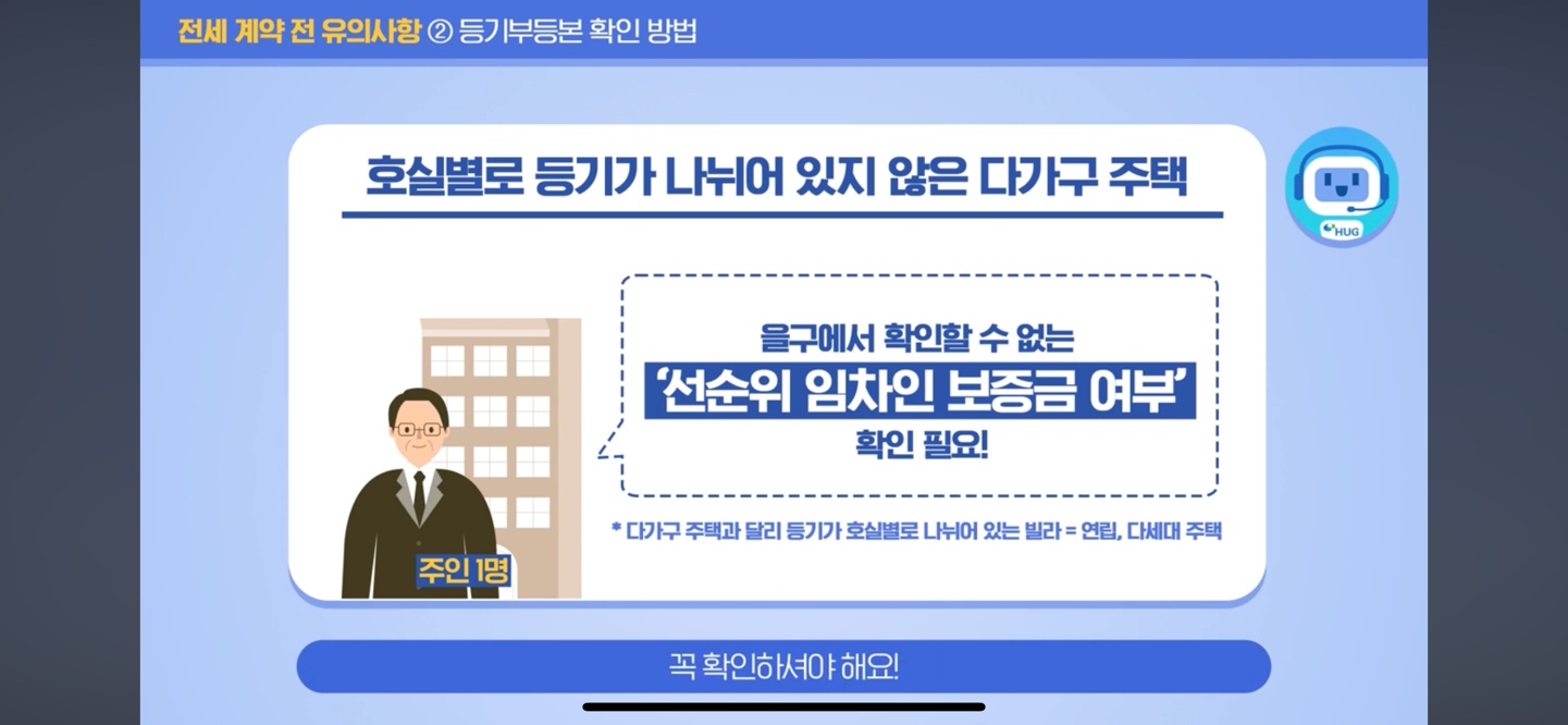 등기부등본에는 표제부, 갑구, 을구가 있으며 특히, 호실별로 등기가 나뉘어 있지 않은 다가구 주택의 경우에는 "선순위 임차인 보증금 여부" 확인이 필요합니다.
