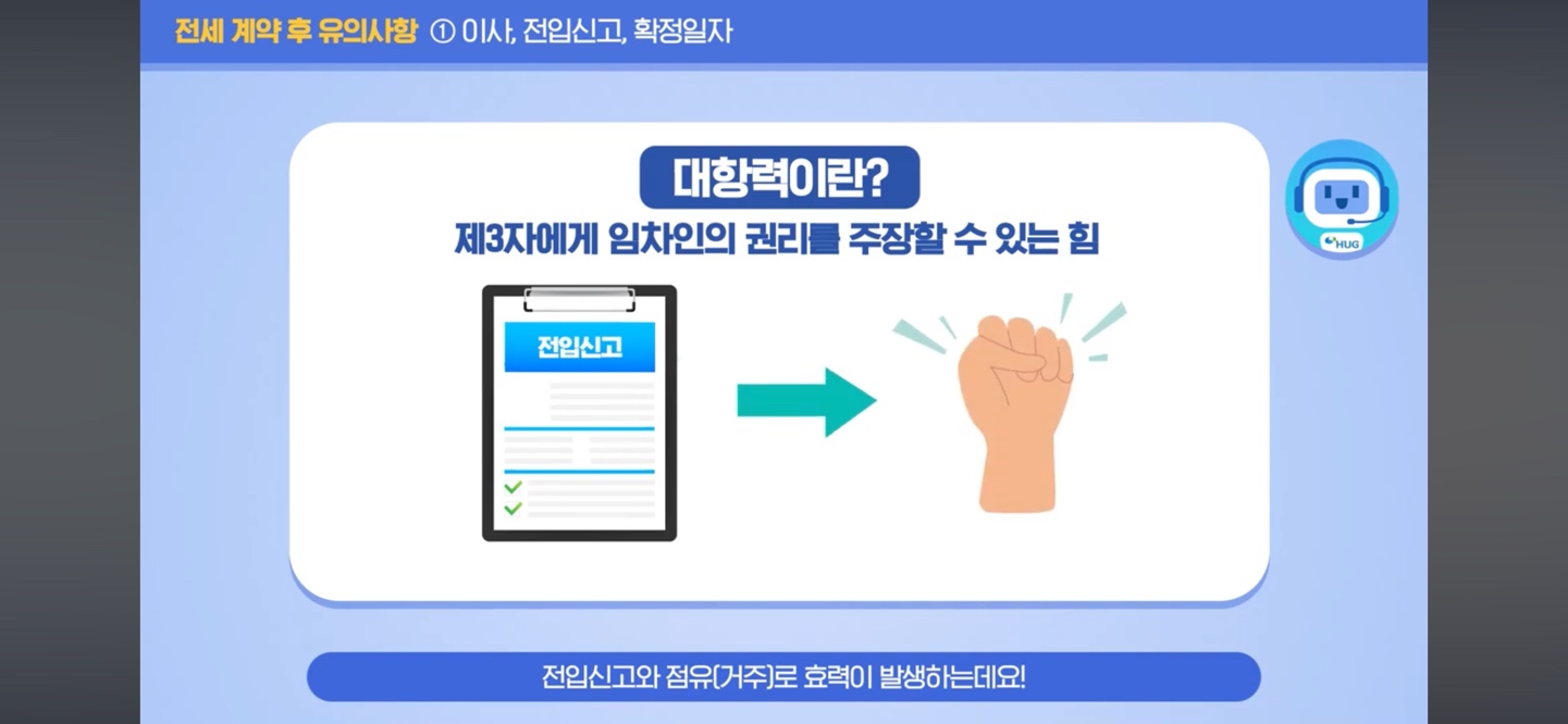 이사 후 필수로 동사무소에 가서 전입신고를 해야 임차인의 권리를 주장할 수 있습니다.